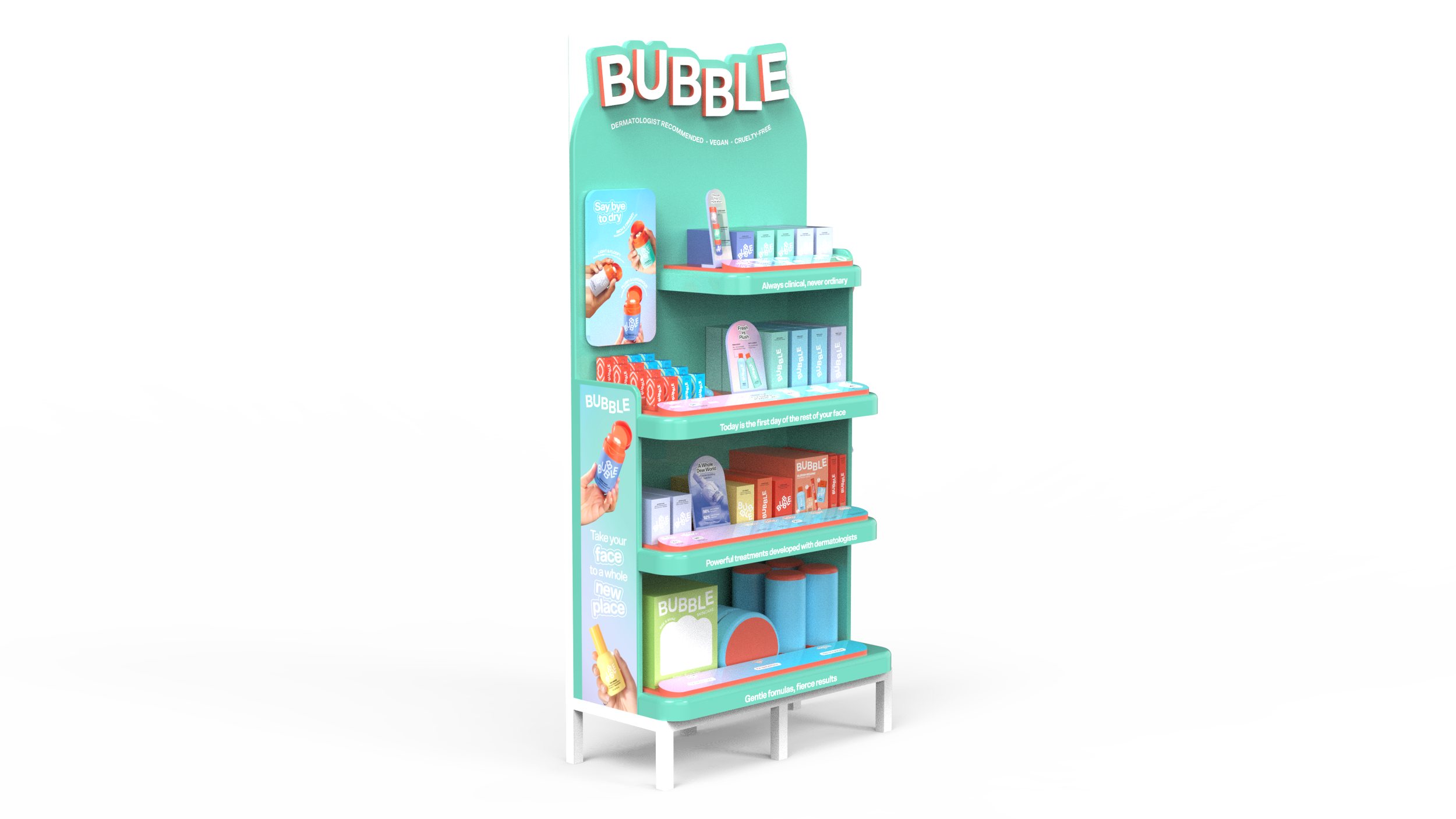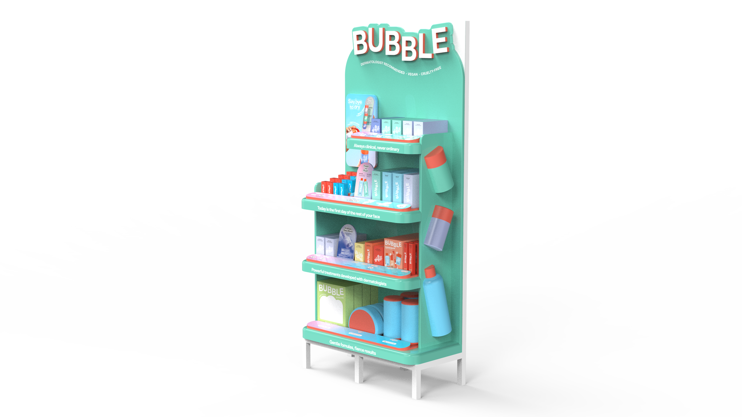 In addition to consumer packaging, I designed and developed a wide range of in-store retail displays— including permanent endcaps, single-use endcaps, and table displays for key retail partners such as Ulta, Sephora, Target, Walmart, Boots UK, and Priceline. When the company’s engineer departed, I stepped in to cover engineering responsibilities, reviewing and approving technical drawings and working directly with vendors on sampling, tooling, manufacturing, and issue resolution. I also coordinated closely with operations and retail teams to ensure products were assembled correctly and delivered on time to Bubble’s warehouses and retail partners’ distribution centers.